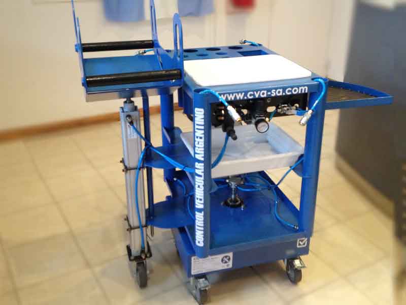 El constante trabajo en el servicio mecánico nos ha impulsado a desarrollar un dispositivo que resuelva las necesidades del mecánico moderno. Este dispositivo, resuelve el tedioso esfuerzo de elevar y colocar neumáticos de camionetas (suv) cada vez más pesados en los elevadores. Evitando de esta manera problemas con el personal. Así mismo es un poderoso centro de asistencia para el mecánico, proveyéndolo de una conexión de aire, un equipo de extracción de fluidos por vacío de última generación. También posee un porta herramientas y estantes diseñados para facilitar la operación del mecánico actual. El mismo es rotativo con ruedas con frenos para su desplazamiento.
