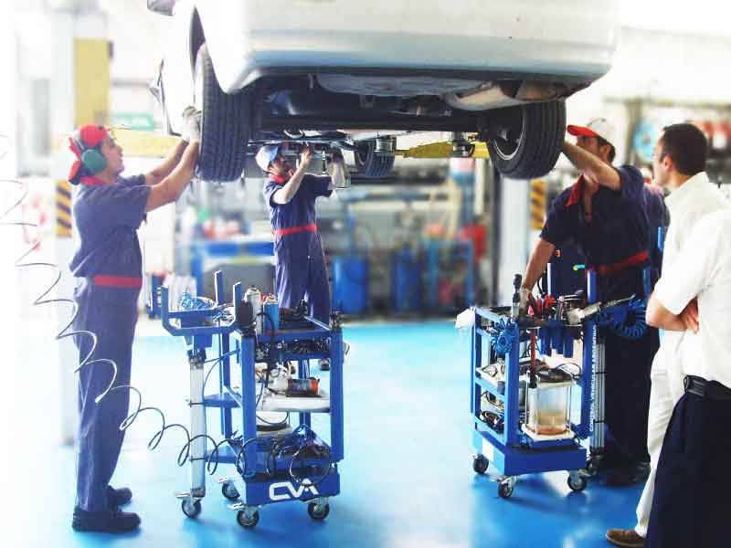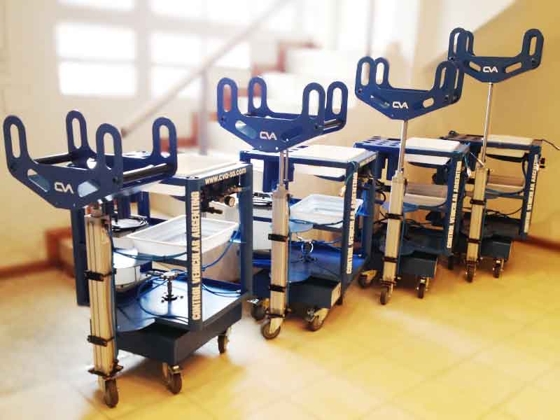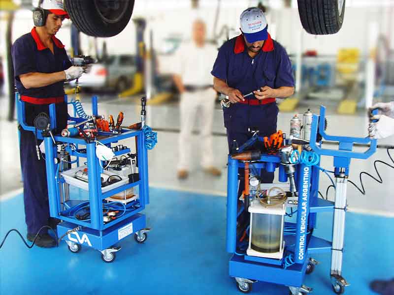 El constante trabajo en el servicio mecánico nos ha impulsado a desarrollar un dispositivo que resuelva las necesidades del mecánico moderno. Este dispositivo, resuelve el tedioso esfuerzo de elevar y colocar neumáticos de camionetas (suv) cada vez más pesados en los elevadores. Evitando de esta manera problemas con el personal. Así mismo es un poderoso centro de asistencia para el mecánico, proveyéndolo de una conexión de aire, un equipo de extracción de fluidos por vacío de última generación. También posee un porta herramientas y estantes diseñados para facilitar la operación del mecánico actual. El mismo es rotativo con ruedas con frenos para su desplazamiento.